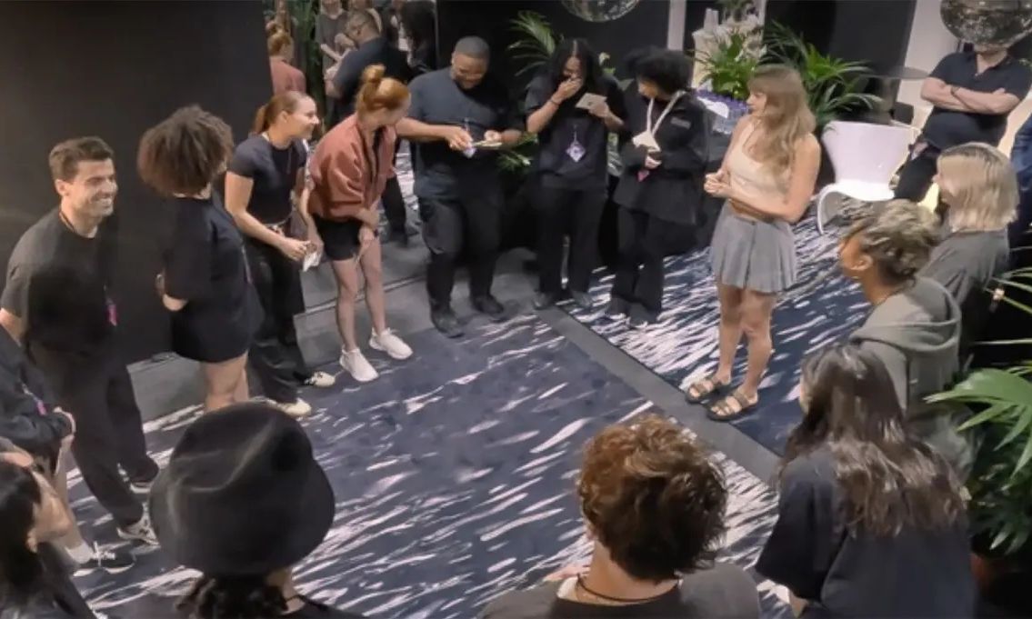 «Η πλήρης ευγνωμοσύνη μου δεν προέρχεται από τράπεζα, αλλά εδώ είναι [αναγράφεται το ποσό] δολάρια για να σας ευχαριστήσω. Με αγάπη, Τέιλορ», συνέχισε. Το ακριβές ποσό που έδωσε η Σουίφτ στους χορευτές λογοκρίθηκε στο βίντεο.